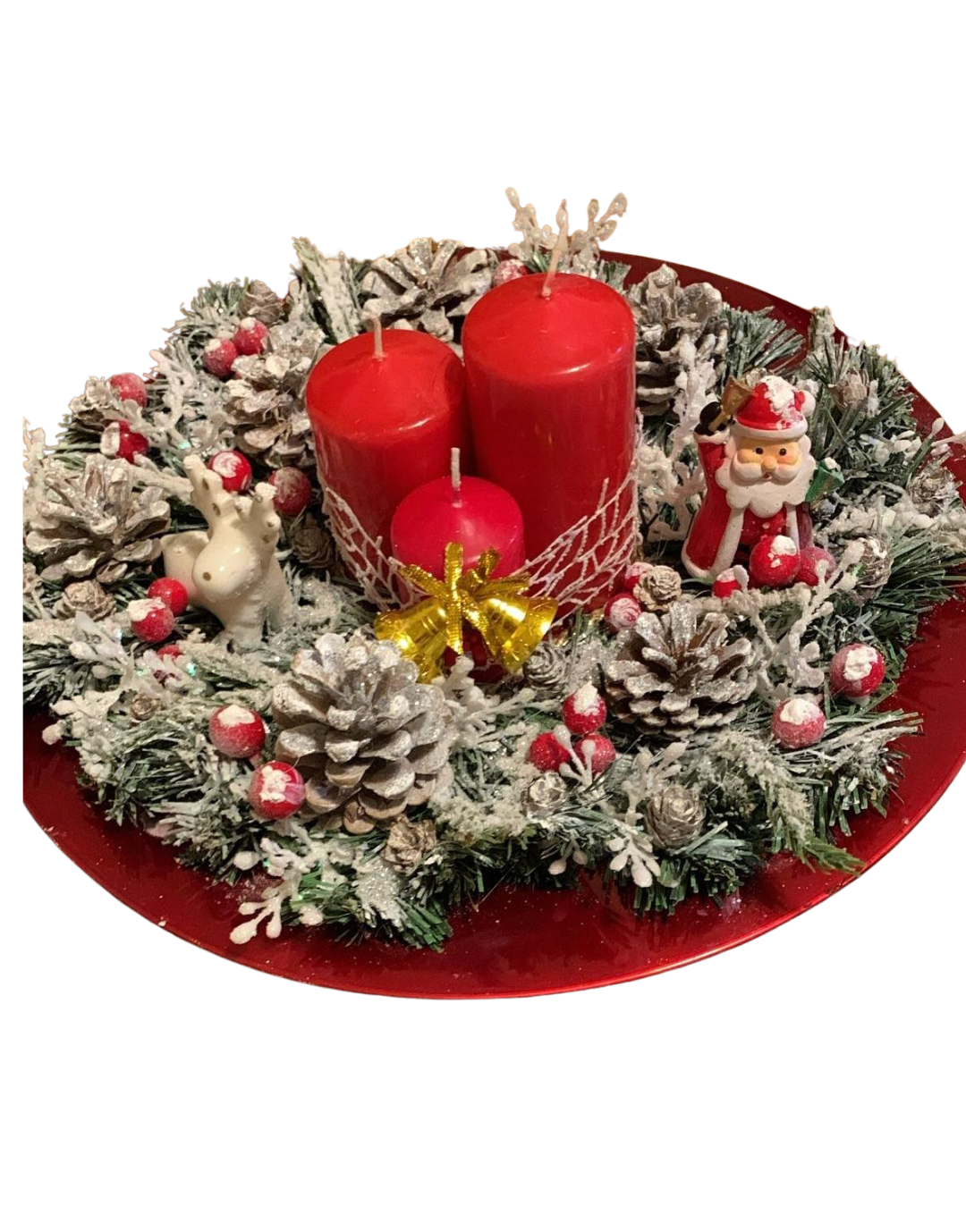 Immagina un centrotavola che cattura l'essenza del Natale con eleganza e calore. Al centro, una candela alta e slanciata, avvolta da un nastro rosso vellutato, che diffonde una luce soffusa e accogliente. Attorno alla candela, una corona di rami di pino freschi, arricchita da bacche rosse scintillanti e piccoli ornamenti dorati. Tra i rami, spuntano delicati fiori bianchi di agrifoglio e piccole pigne innevate, che aggiungono un tocco di natura e freschezza.