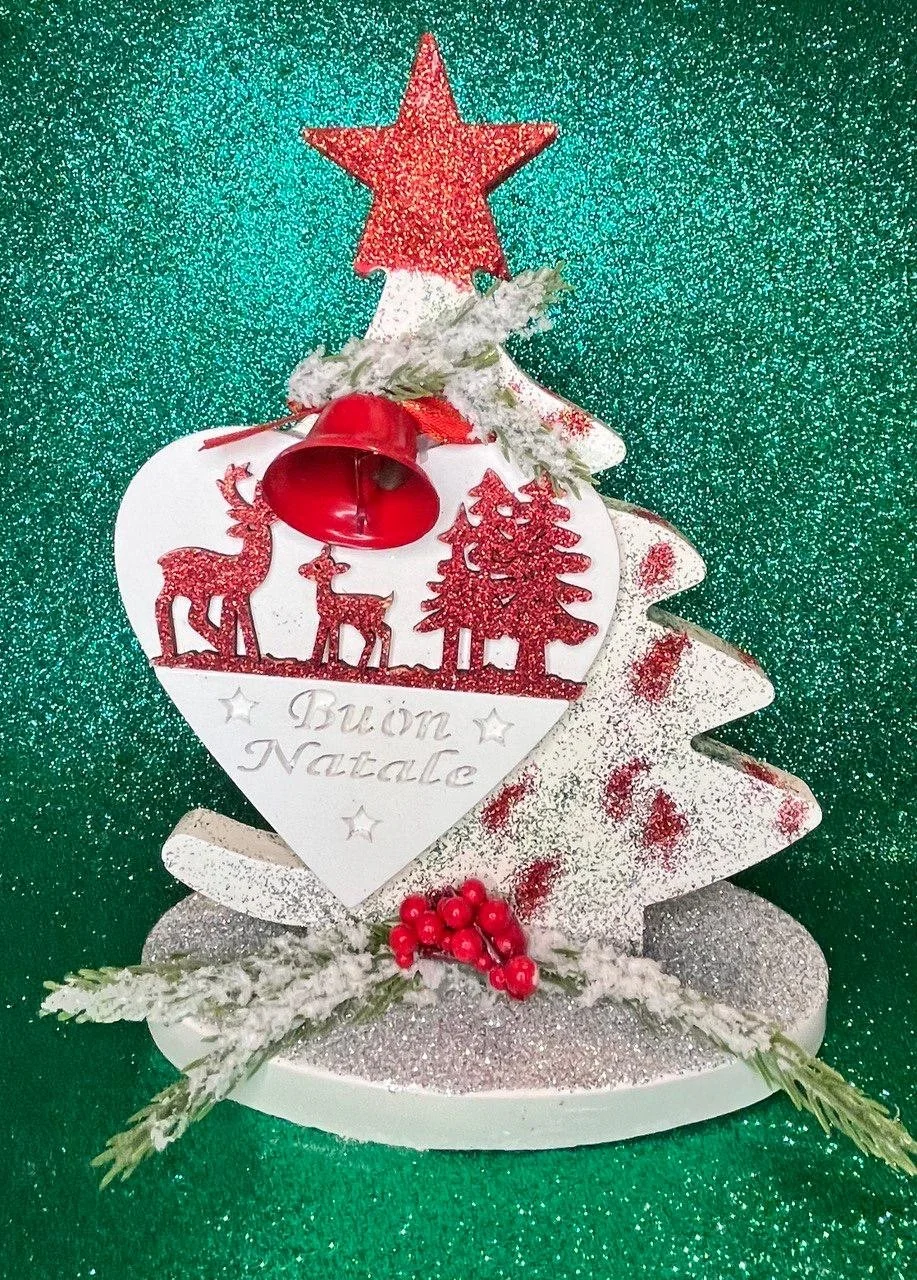 Il tutto è posato su una base di legno rustico, che conferisce un senso di calore e tradizione. Questo centrotavola non solo decora la tavola, ma crea un'atmosfera magica e festosa, perfetta per le cene natalizie in famiglia