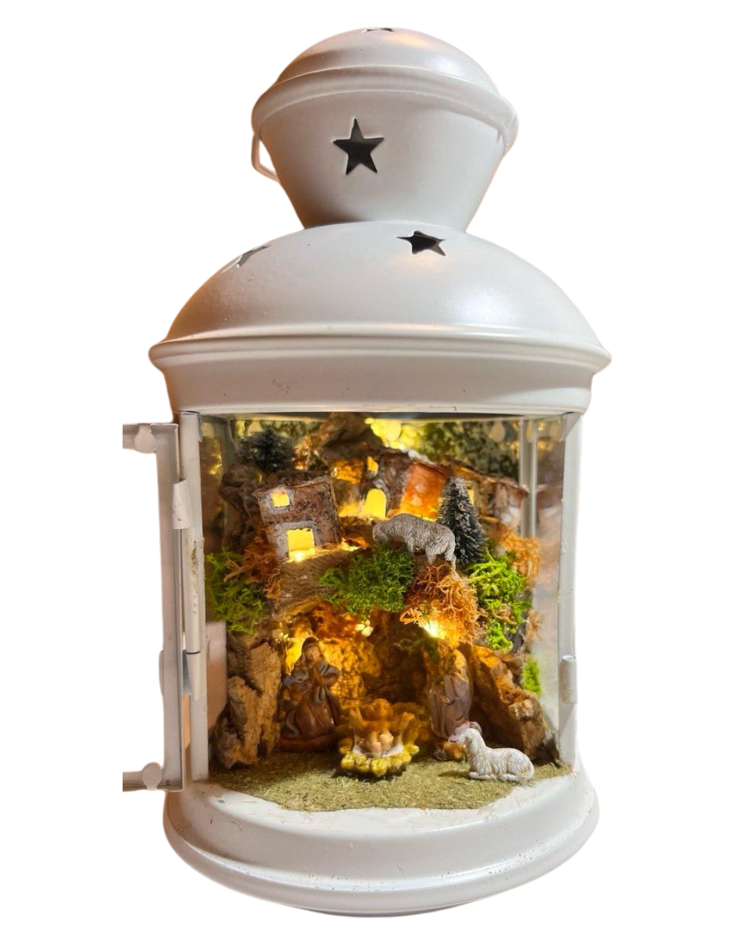 Le lanterne sono illuminate da luci a LED calde, che creano un'atmosfera accogliente e magica, facendo risplendere le figure del presepe con una luce soffusa. Il tetto delle lanterne è decorato con piccoli rami di pino e bacche rosse, aggiungendo un tocco di natura e festività.